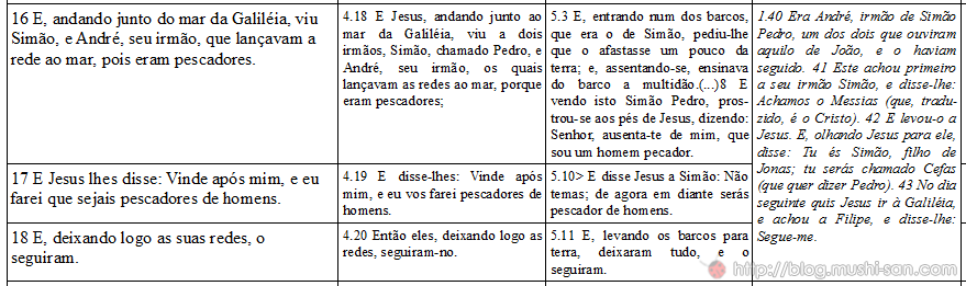cliquem pra ampliar e talz - cada coluna é, respectivamente: Marcos, Mateus, Lucas e João