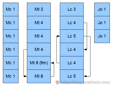 Mas o que achei interessante é que os evangelistas não se seguiram linearmente: além de cortes e inserções, a tabela que estou montando me mostrou que os autores também brincaram de embaralhar as passagens do texto alheio, assim: