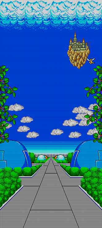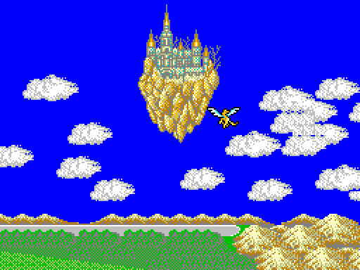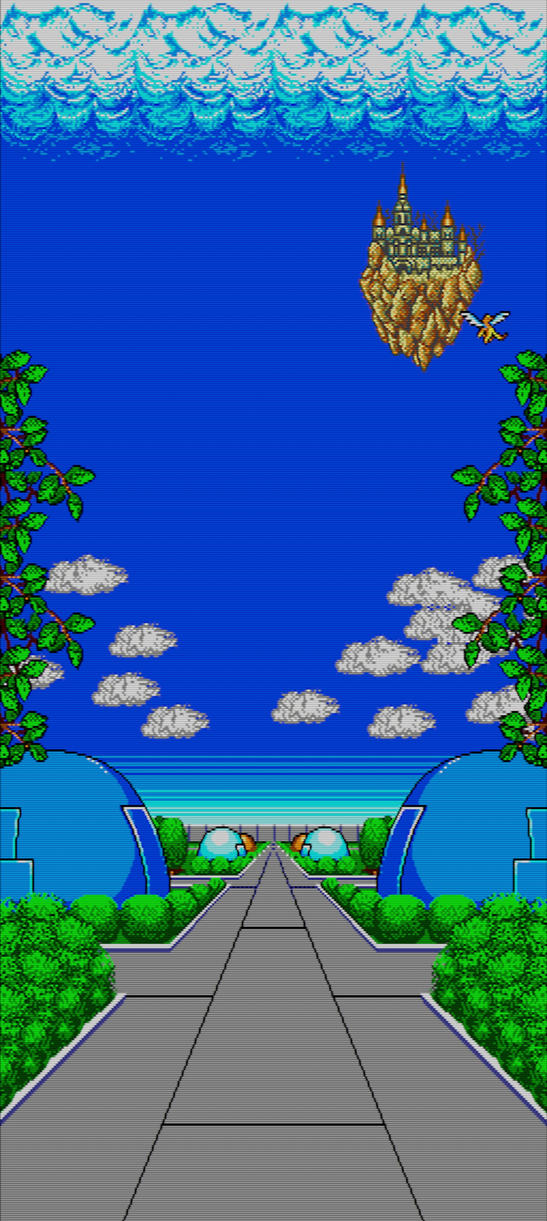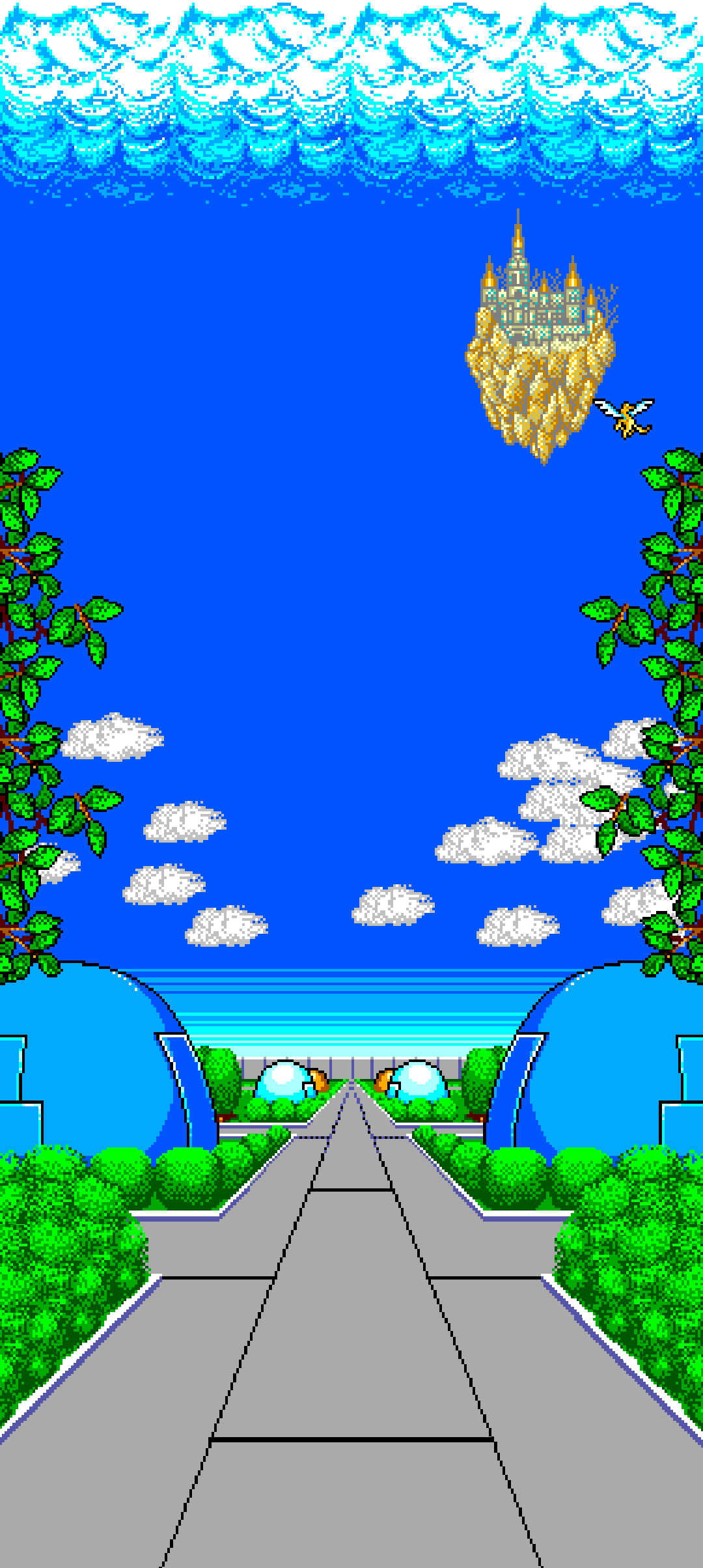 Camineet, lar de Alis. Usei elementos do jogo (e algumas duplicações de ctrl+c/ctrl+v para "esticar" a imagem para cima e para baixo). As nuvens mais altas foram retiradas do cenário que aparece quando há batalhas contra monstros litorâneos. Depois fiz uma segunda versão com o lar do vilão nos céus, e aproveitei para roubar mais algumas nuvenzinhas na imagem.
